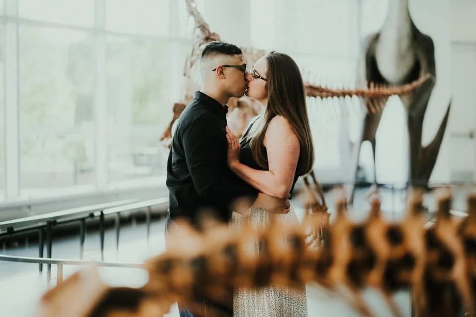Couples portraits are tailored to each specific couple. We can capture your love at the science museum amid dinosaurs (pictured above), sharing an ice cream cone in the park, romantically in a field of flowers, or during a perfect golden hour sunset. Whether celebrating love or engagement, we focus on natural moments that encompass the special love each couple shares.